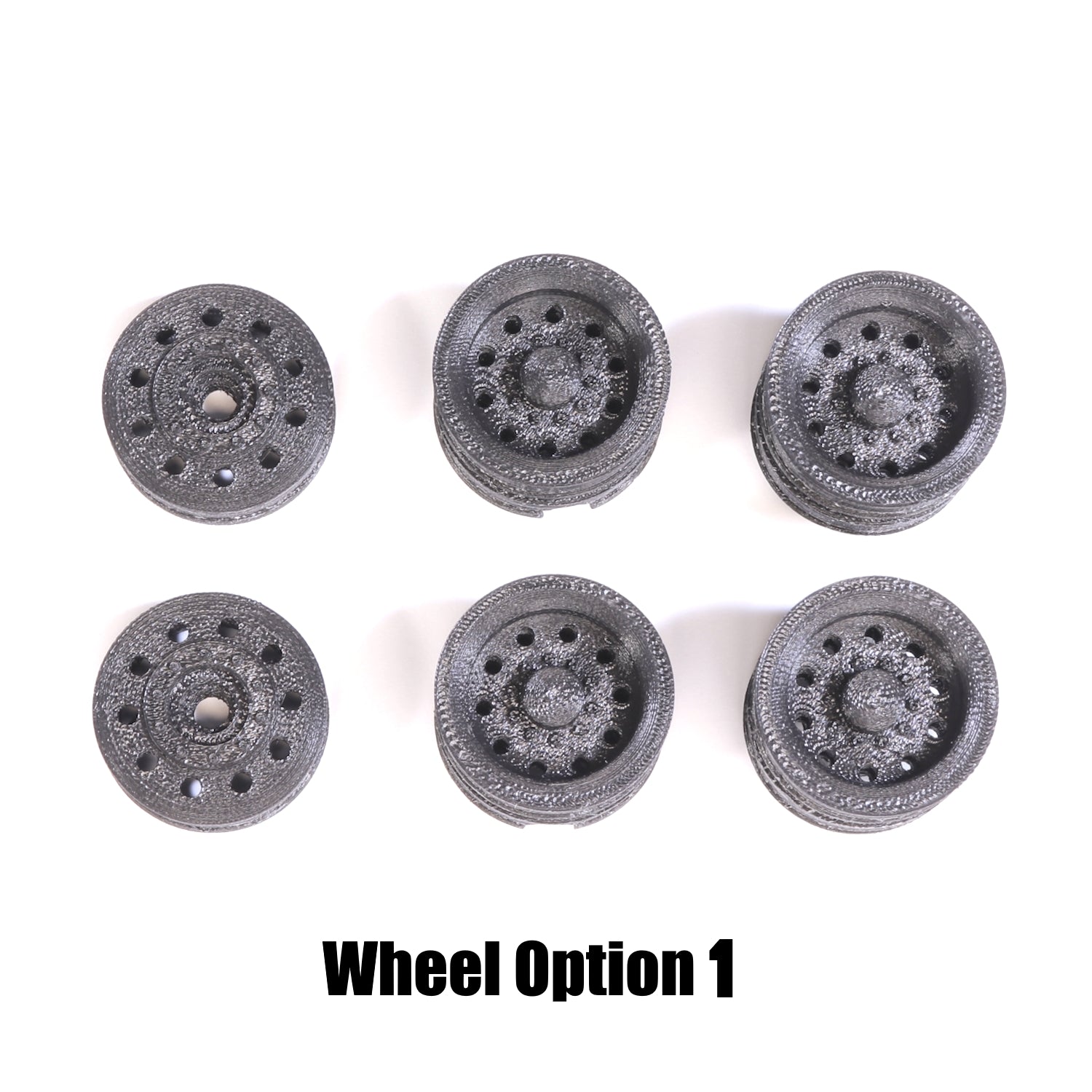 These wheels are compatible with the CTC 01 chassis. No tires are included. Wheels are 3D printed using black PLA plastic. Painting is recommended to achieve the best final appearance.